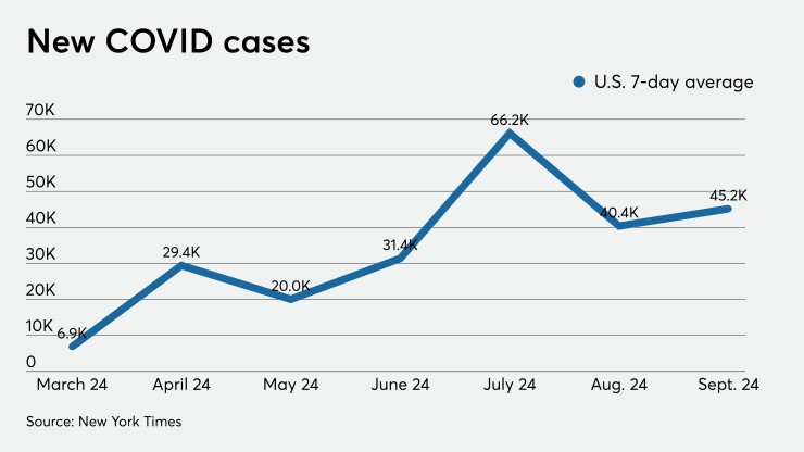 As of Sunday, new COVID diagnoses in South Dakota were up 74% over a 14-day period, according to data from the New York Times. The state’s infection rate was relatively level throughout the summer before beginning to rise in mid-August. North Dakota has seen a similar spike, with new cases beginning to rise in mid-July, and diagnoses as of Sunday up 53% compared to two weeks prior.