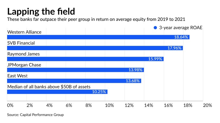 All of that momentum — plus the company's above-peer loan growth and its low efficiency ratio — put Western Alliance at No. 1 on the 2021 list of top-performing banks with $50 billion or more of assets compiled by Capital Performance Group. It's Western Alliance's first appearance on the big-banks list, which for 2021 includes 39 large and regional banks ranked by their three-year return on average equity, starting with 2019. (See data table at bottom of article.)