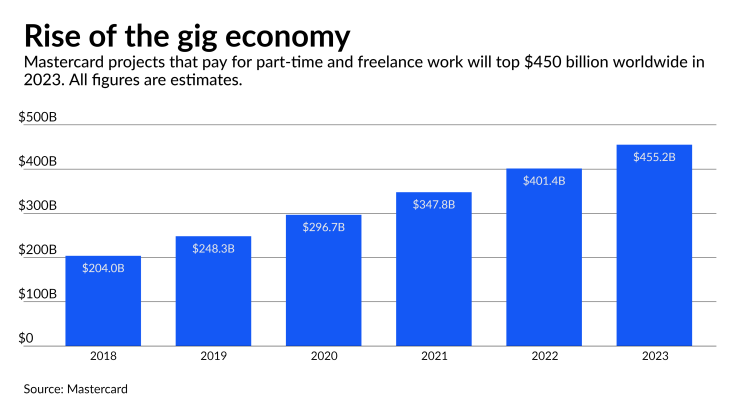 The number of gig workers has been growing steadily since 2017 and many expect that to continue. Mastercard estimates that the total volume of gig work pay will reach $455 billion globally by 2023.