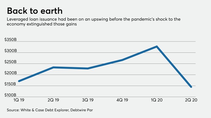 That trend that was also present in the second quarter, where the issuance of leveraged loans was about $113.8 billion, down from $271.5 billion in the first quarter, according to Refinitiv LPC. Similarly, a recent report by the law firm White & Case said U.S. leveraged loan issuance in the second quarter totaled just under $145 billion, a sharp 55.7% drop from the previous quarter and a 38% decline from a year earlier.