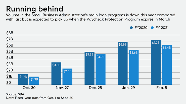 Volume in the SBA’s 7(a) program is down 11% in the 2021 fiscal year from a year earlier, at $6.4 billion. The agency's fiscal year began on Oct. 1.
