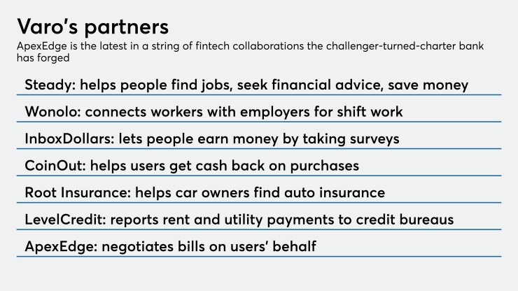 Besides ApexEdge, Varo works with Steady and Wonolo, providers of apps that help consumers find work, and InboxDollars, a company that rewards participants for completing surveys. The digital bank has also partnered with the cash-back app CoinOut, auto insurer Root Insurance and credit-building service LevelCredit.