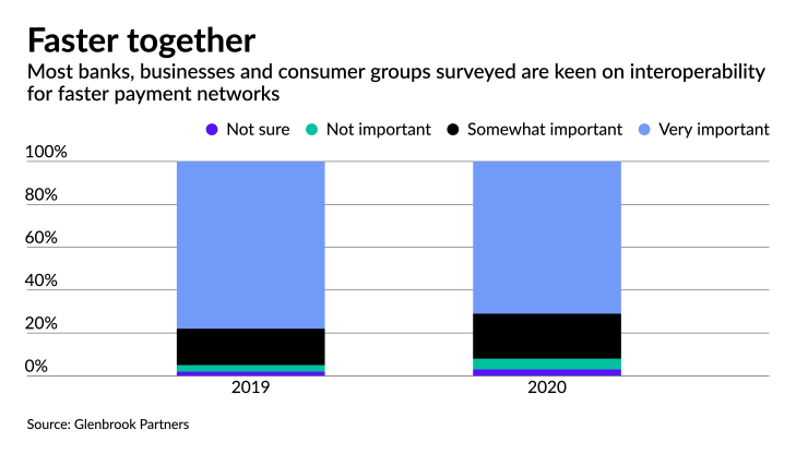 The U.S. Faster Payments Council says the interoperability question has become the most important topic within the payments industry in the past few years. Nearly 80% of respondents to an online survey in 2019 and 71% in 2020 cited interoperability as "very important" across compatible faster payments systems, according to the council's most recent research. Its report included interviews with financial institutions, business users and consumer advocacy groups.
