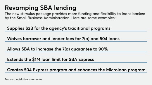 The legislation allows the Small Business Administration to waive fees and raise the guarantee for 7(a) and 504 loans, which could encourage more small businesses to apply for loans as the economy recovers.