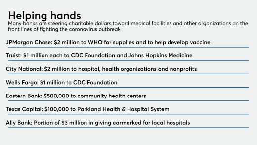 From helping hospitals purchase new testing kits and ventilators to backing efforts to develop a COVID-19 vaccine, banks large and small are pledging millions of dollars to assist with medical relief efforts.