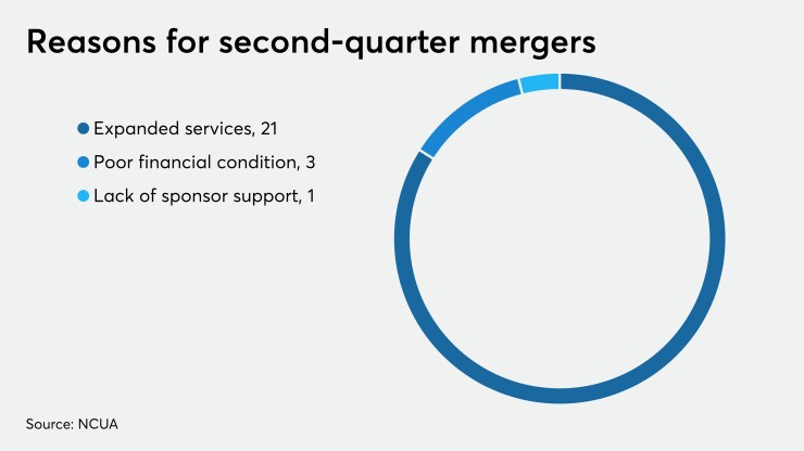 Of the 25 CUs merging, 18 reported losses. The overwhelming majority of merging credit unions cited expanded financial services as their primary reason for merging, though a few also noted poor financial condition or lack of support from its sponsor group. Many credit unions, particularly smaller ones, frequently also merge due to the difficulties in succession planning.