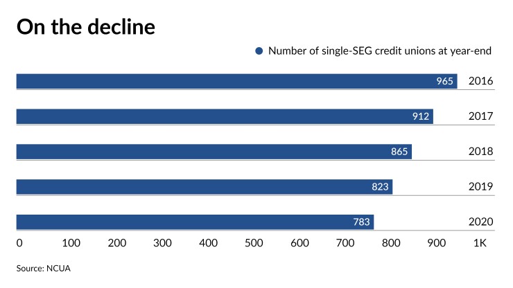 There were 965 single common-bond credit unions operating in 2016, but by the end of last year that figure had fallen to 783, or about 15% of the industry as a whole. Many of those single-SEG shops that disappeared did so by merging into larger institutions.