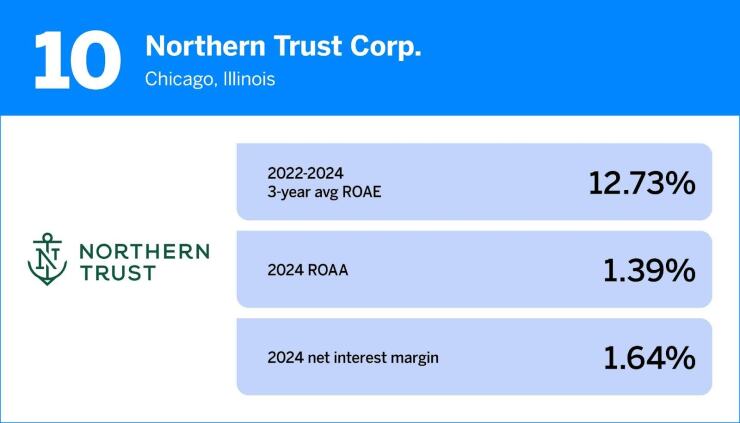 Below are performance metrics from 2024 for the 10 highest-performing banks with more than $50 billion of assets. Click on the table at the bottom of the page for the full ranking of banks in the asset class.
