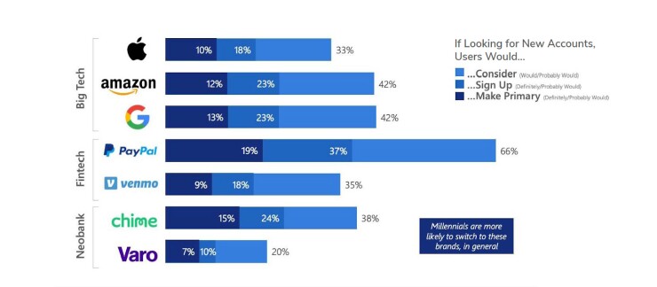 Mobile-first, data-informed fintech and neobank experiences emulating those of Big Tech companies have swayed 79% of digital banking consumers across all generations to consider opening a new checking or savings account with a technology-driven organization. While half of respondents reporting they would