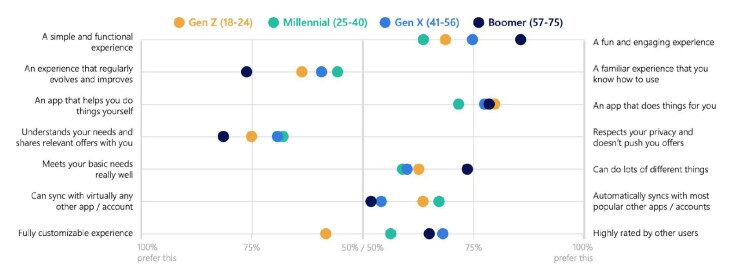 As our research shows, imposing one’s own deliberate or unconscious generational bias risks missing the bigger picture that brilliant digital user experiences are, in fact, universally lauded by all. The data reveals that Baby Boomers are more likely to prefer an engaging, ever-evolving, relevant, and multifunctional digital banking experience than all other generations and are just as likely to want it to be autonomous as Gen Zers.