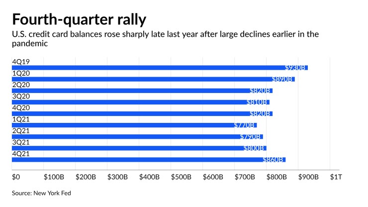 “For cards, it's really going to be about payment rates and how they taper off — hopefully taper off,” Citi Chief Financial Officer Mark Mason said during a Jan. 14 call with analysts. “They've been stubbornly high through all of 2021.”