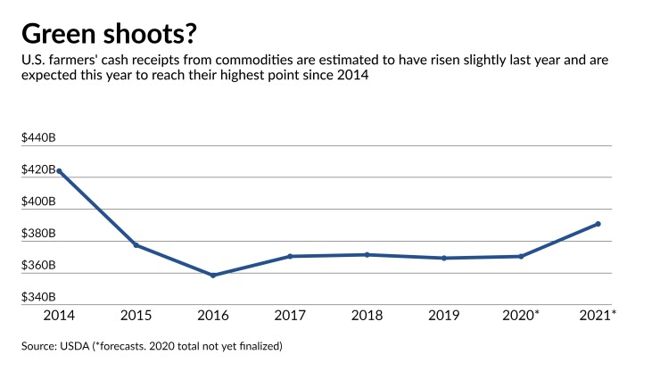 The Department of Agriculture said it expects farm income will total $111.4 billion in 2021. That would mark an 8% decline from last year, but solely because of the record government support in 2020. The current year projection would exceed by 21% the 2000-2019 average despite an expectation for farm subsidies to decline by 45% from last year, Seth Meyer, USDA chief economist, said at a virtual forum in February. That, he said, means cash income from crops is likely to surge this year.