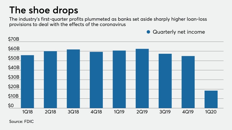 The FDIC’s Quarterly Banking Profile paints a dour picture for the U.S. banking sector during the three months that ended March 31. The virus outbreak took hold in March and banks finished the quarter with $18.5 billion in net income, a precipitous fall of 69.6% compared with the year-earlier period. The pain was widespread; the FDIC said more than half of all banks reported a decline in annual net income.