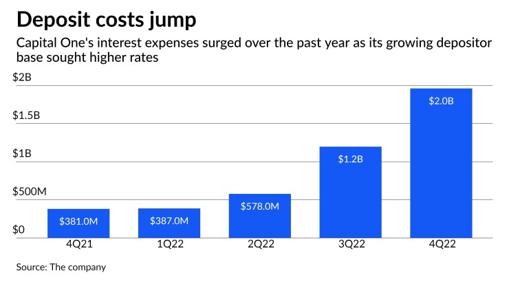 But Capital One executives said Tuesday they nonetheless expect deposit costs will keep rising. While the Fed's rate increases last year allowed Capital One to rapidly pass along higher rates to borrowers, executives said the impact of higher deposit rates on the bank's expenses is a bit more gradual.