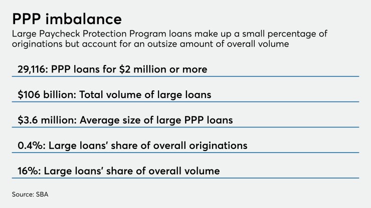 Lenders have originated more than 29,000 loans of $2 million or more under the PPP, accounting for just 0.4% of total loans. But they make up 16% of the $651 billion in funds approved by the SBA.