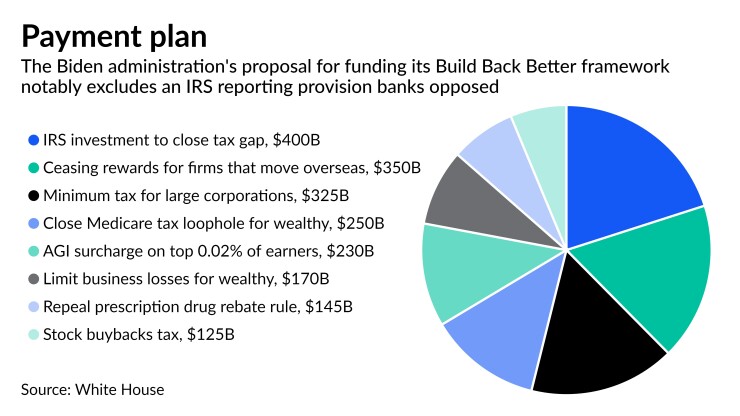 And even as the government appears to be backing away from the original scope of the IRS reporting plan, tax enforcement remains the single largest source of revenue contained within the most recent form of the White House's Build Back Better framework. Improved IRS tax compliance would generate $400 billion in revenue in the roughly $1.75 trillion spending package.