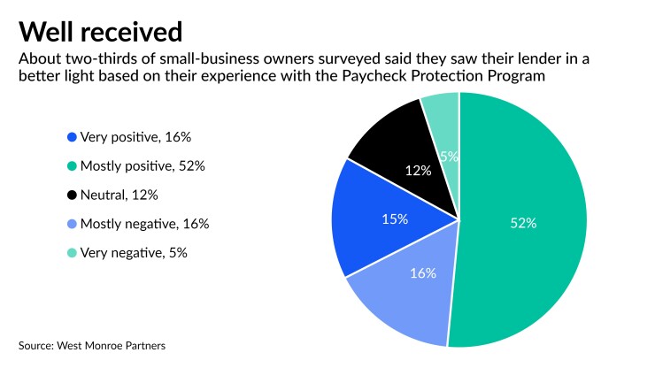 In April, the consulting firm West Monroe Partners began surveying 401 small-business owners about their PPP experience and whether it changed their perception of their lender. Roughly two-thirds reported a positive change, versus only 21% who reported a negative one, according to a report the firm published in October.
