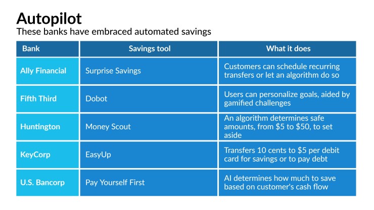Traditional banks are offering and building upon a type of digital banking tool fintechs made popular: automated savings. This technology gives consumers myriad ways to put money aside without having to think about it or do anything.