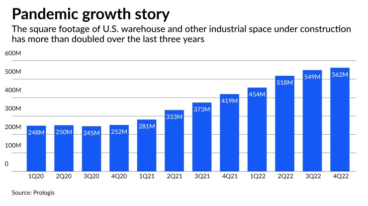 Though higher interest rates have slowed new construction, building pipelines remain far larger than in the past. Some 562 million square feet of U.S. industrial space were under construction at the end of 2022, up sharply from around 250 million square feet in 2020, according to Prologis.