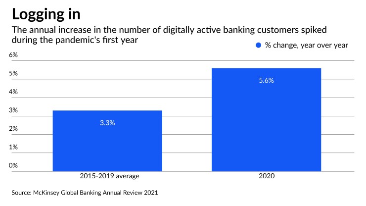 The high achievers include fintechs and other digitally savvy competitors that continue to take market share. According to the report, 28% to 30% of Americans already bank with fintechs, which have captured 3% to 5% of total U.S. banking revenues. In 2020, the number of digitally active banking customers rose 5.6% from the previous year, compared with an average year-over-year increase of 3.3% between 2015 and 2019, according to McKinsey.