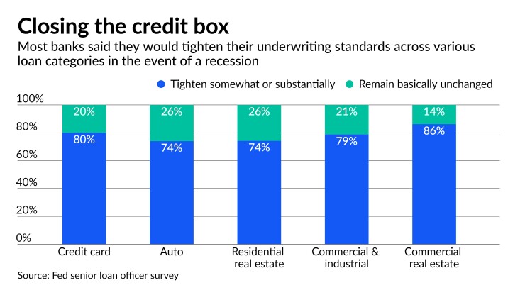 If the U.S. economy falls into a recession, more than 80% of banks said they would "somewhat" or "substantially" tighten lending standards for credit cards and loans backed by commercial real estate. More than 70% of banks said they would do the same for auto, commercial and industrial and residential real estate loans.