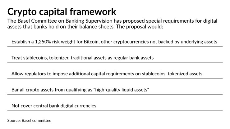 WASHINGTON— Although banks are only starting to grapple with the rising popularity of cryptocurrencies, a framework from global banking regulators outlining possible capital charges for them is a likely preview of how financial institutions could soon come to view digital money.