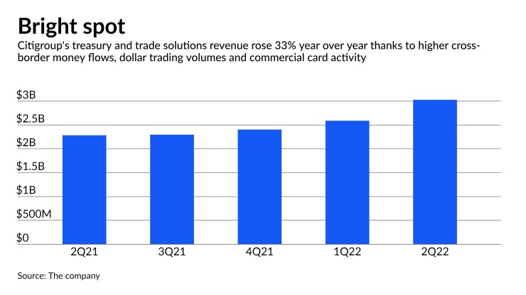 One particularly shiny spot: treasury and trade solutions, a darling within Citi’s institutional clients group business. Second-quarter revenues for the division, which helps global companies manage their treasuries, payments and commerce needs, jumped 33% year over year to $3 billion, partly due to higher interest rates, but even more so because of an uptick in client activity in the form of higher loans, higher deposits and an increase in cross-border transactions.