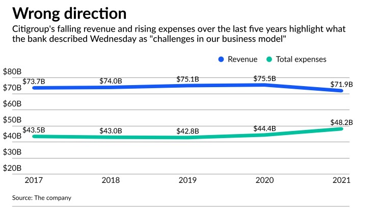 Between 2017 and 2021, Citi’s annual revenues fell from $73.7 billion to $71.9 billion, while its total expenses rose from $43.5 billion to $48.2 billion.