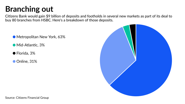 The deal, which includes $9 billion of deposits, $2.2 billion of loans and 80 East Coast branches, was largely opportunistic, Citizens Chairman and CEO Bruce Van Saun said in an interview Thursday. Specifically, it would lower the $187 billion-asset firm’s loan-to-deposit ratio, immediately put Citizens into some geographies it’s been eyeing, and add to its digital franchise, Citizens Access. About 31% of the deposits are in HSBC’s direct bank, which Citizens is also acquiring.
