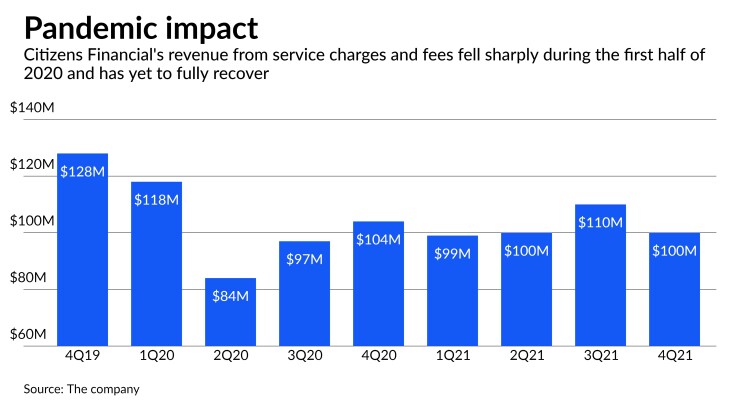 Service charges and fees, which include overdraft fees, fell to $100 million during the fourth quarter — a 4% decline from the same period in 2020 — largely because of a new policy that gives customers 24 hours to reverse overdraft charges.