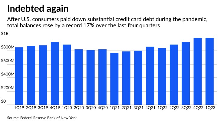 Credit card balances stood at nearly $1 trillion at the end of the first quarter, up from about $840 billion one year earlier, according to a quarterly report on household debt from the Federal Reserve Bank of New York. The 17% yearly increase was higher than any other period in the data's 20-year history.