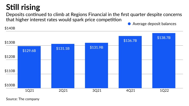 With interest rates rising, Regions Financial has been waiting for a chunk of its deposit base to dissolve. The Birmingham, Alabama, bank is still waiting.