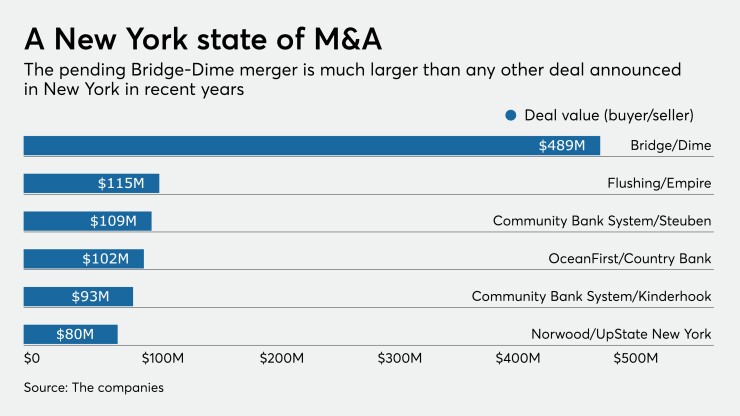 While the $6.3 billion-asset Dime has spent recent years reducing its dependence on commercial real estate, notably multifamily lending, its ratio of CRE to total risk-based capital was 556% on March 31. Its ratio will still remain above 500% after merging with the $5.1 billion-asset Bridge.