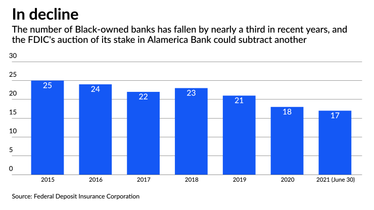 While a preliminary bidder’s list included several large Black-owned banks, it also included some non-minority bidders. Founded in January 2000, the $15.4 million-asset Alamerica is the smallest of the 17 remaining Black-owned banks in the United States.