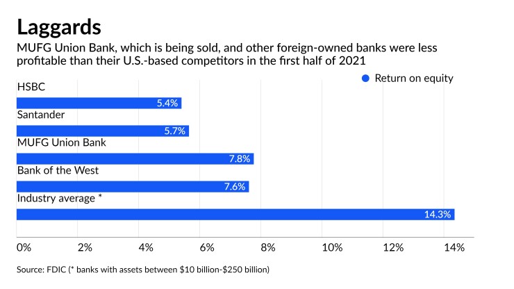Foreign bank-owned entities have chronically underperformed in comparison with similarly sized U.S. banks, according to an analysis of the performance metrics at banks with between $10 billion and $250 billion of assets. During the first six months of 2021, HSBC, MUFG Union Bank, Santander Holdings USA and Bank of the West all fell short of industry averages for net interest margin, efficiency ratio, return on assets and return on equity, the analysis found.