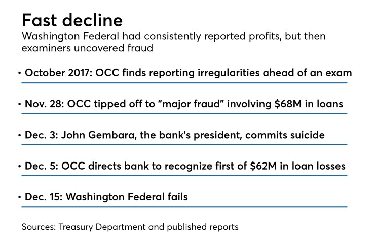The Treasury Department’s Office of Inspector General determined in a material-loss review released in November 2018 that if had examiners acted in a timelier manner the fraud “may have been uncovered sooner and the loss to the DIF and individual account holders may have been reduced.”