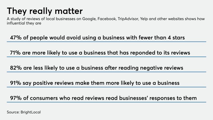The more reviews — especially positive ones — a bank has, whether on its own website or on third-party services such as Google, Facebook or Yelp, the better its chance of ranking well in Google searches. When an institution is more “discoverable,” more consumers are likely to click on the website, place a call or search for driving directions, said Shane Closser, head of industry for financial services at Yext, whose Yext Reviews service helps companies monitor and respond to online reviews.