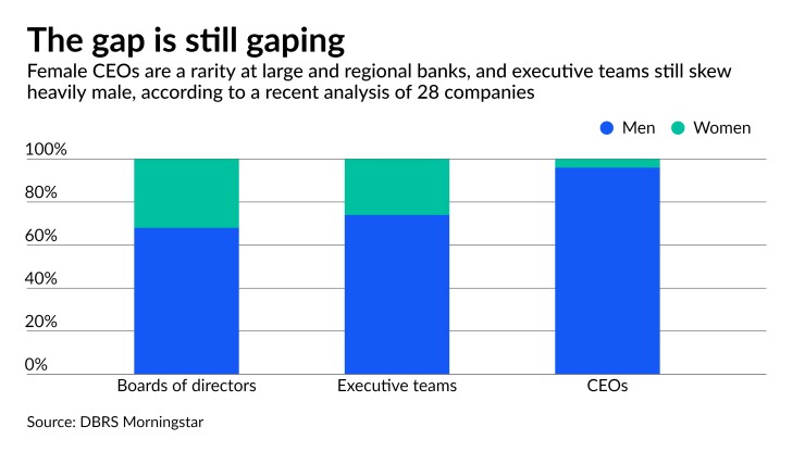 Among the 28 banks — which run the gamut from JPMorgan Chase and Citigroup to smaller regionals such as Bank of Hawaii — women on average made up 26% of executive management teams last year and 32% of boards of directors, according to the report.