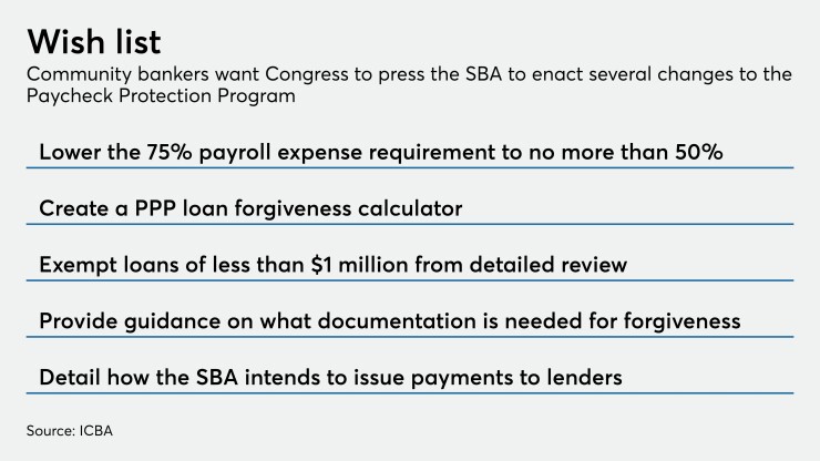 The ICBA is also pushing its members to directly lobby Congress to intervene. They want lawmakers to lower the payroll threshold to 50%, require the SBA to create a forgiveness calculator and exempt small-dollar loans from detailed review, among other things.