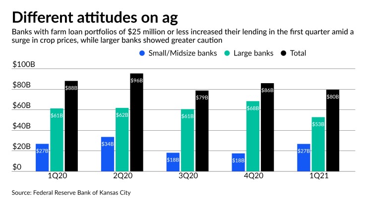 Volumes were flat year-over-year for small ag banks and declined for larger lenders. But more loan growth could come for ag lenders of various sizes as farmers seek to boost their production to take advantage of the higher prices.