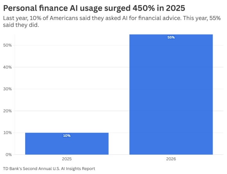 Last year, only 10% of surveyed Americans reported they had asked large language models such as ChatGPT and Claude for financial advice. This year, 55% did so, according to TD Bank's second annual survey of 2,500 consumers, released Tuesday.