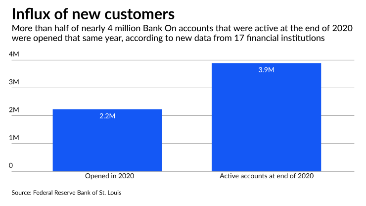 Last year, customers at 17 financial institutions opened 2.2 million new Bank On checking accounts. Among those, 82% were new customers and 79% regularly used online banking options, the St. Louis Fed said in a report based on information submitted to its Bank On National Data Hub.