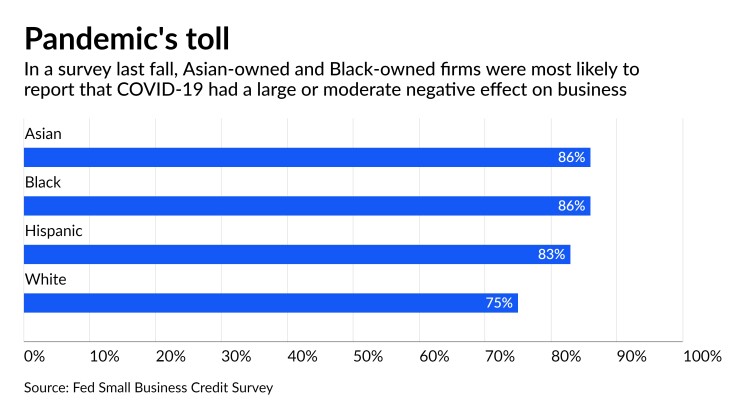 Asian-owned and Black-owned firms provided the worst outlook, with nearly half of such businesses saying the COVID-19 pandemic had a “large negative effect” on their performance, the survey found.