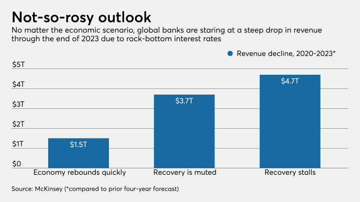 A recent report from the consulting firm McKinsey estimates banks around the world could lose out on $3.7 trillion between the start of this year and the end of 2023, when compared with earlier projections.