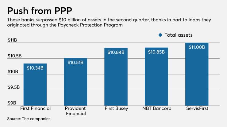 First Financial in Abilene, Texas, would have stayed below $10 billion of assets without the inclusion of PPP loans, according to its filings with the Securities and Exchange Commission. The institution reported about $10.3 billion of assets as of June 30. Similarly, PPP originations helped push ServisFirst Bancshares in Birmingham, Ala., above the threshold. The bank reported about $11 billion of assets last quarter.