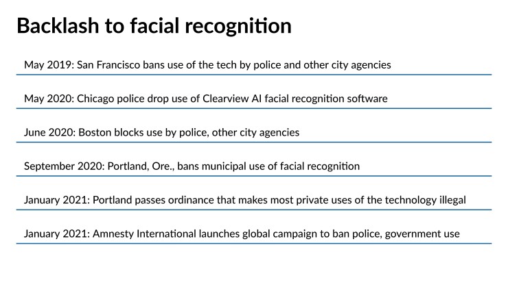 Portland, Ore., which passed an ordinance in January banning the use of facial recognition by private businesses in places of public accommodation, exempts the use of this technology for "user-verification purposes" on an individual's personal or employer-issued "communication and electronic devices."