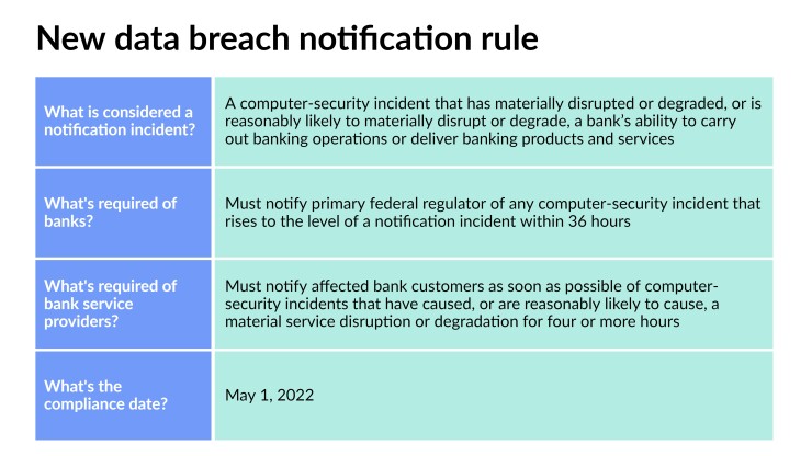 The rule finalized last week from the Federal Deposit Insurance Corp., Federal Reserve Board and the Office of the Comptroller of the Currency states that if an incident has caused serious harm or is likely to, a bank must report the breach to its regulator of record "as soon as possible and no later than 36 hours." It also requires bank service providers to notify affected banks when they have computer-security incidents that are likely to cause a material service disruption or degradation for four or more hours.
