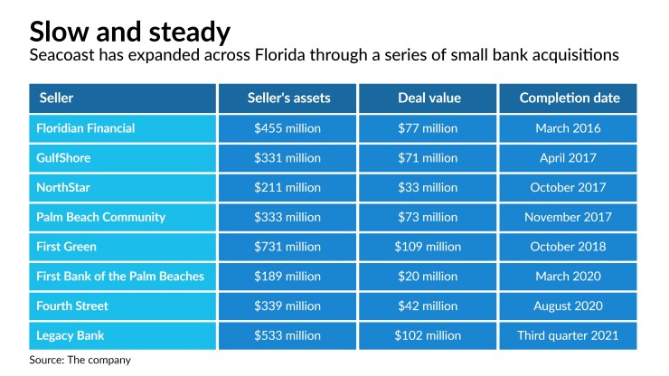 It provides Seacoast with a digestible balance sheet — $432 million of deposits and $482 million of loans — and the change to cut about 45% of Legacy’s annual operating expenses. With that in mind, Seacoast said the deal should be 6% accretive to its 2022 earnings per share.