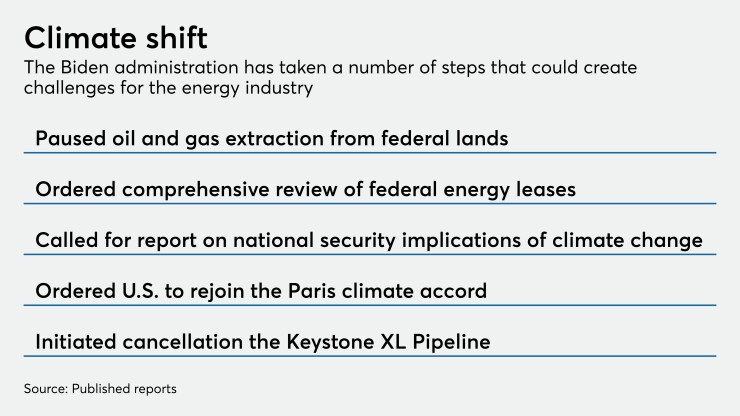 While most energy lenders predict a relatively strong 2021, a series of moves by President Biden designed to curb pollution — including the suspension of new oil and gas leases on federal lands and an effort to stop the Keystone XL Pipeline — could pressure revenue.