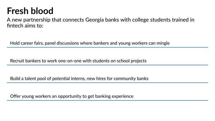 For one, they present an opportunity for students or entry-level employees to gain hands-on experience with fintechs in other parts of the state. “There are great students in middle Georgia who want to stay in middle Georgia,” said Tommy Marshall, executive director of the Georgia Fintech Academy. “There is a meaningful intersection of community bank demand and need, and students that are committed to their communities.”